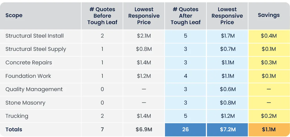 Not only was Tough Leaf able to meet the requirement with a wide range of exceptional options for each scope, but our team solicited 3 bids per scope, which led to a competitive bidding environment that further reduced cost.