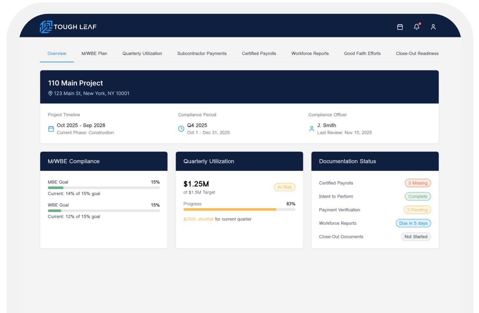 ClearComply picks up where pre-construction ends — and works seamlessly within Tough Leaf's connected platform. Paired with ManagedOutreach for done-for-you sourcing and ClearSpend for organization-wide spend visibility, ClearComply completes the construction-phase compliance layer so prime contractors and government teams have full operational coverage from the first sourcing search through final closeout.When projects require deeper pre-construction support or portfolio-wide reporting, teams can extend into the full Tough Leaf ecosystem without changing systems.
